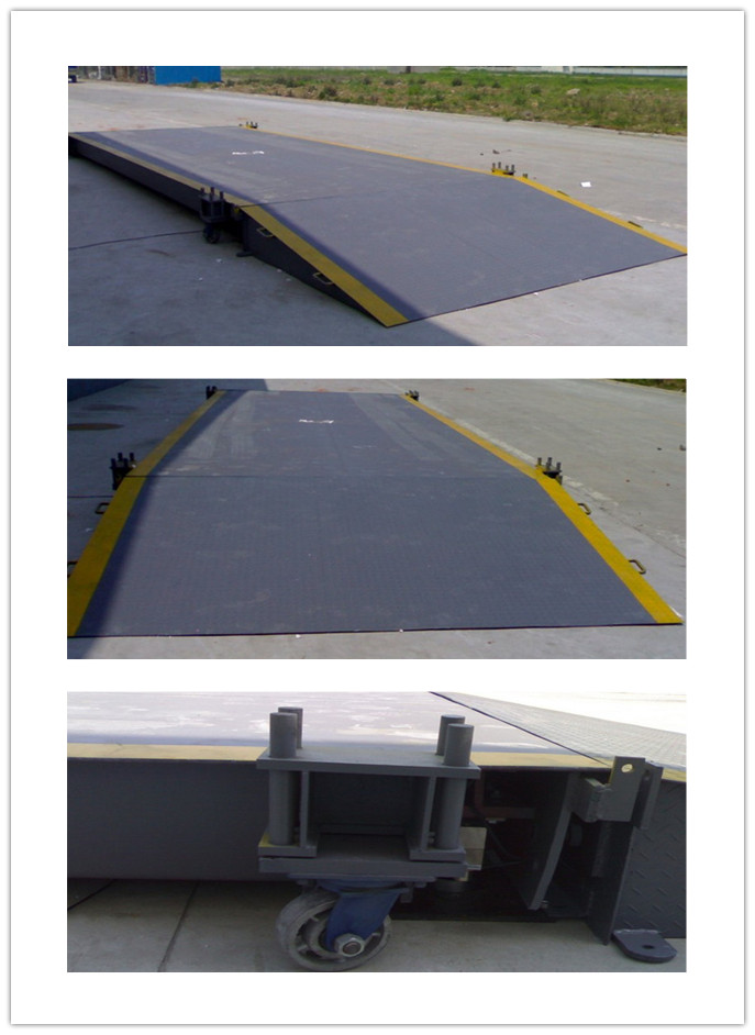 秤臺(tái)超低外型設(shè)計(jì),抗沖擊能力強(qiáng);斜坡與秤體一體化設(shè)計(jì),合適的爬坡角度,使車輛輕松上秤稱重,獨(dú)特的秤臺(tái)液壓升高導(dǎo)向系統(tǒng)及特制的超重載萬(wàn)向移動(dòng)輪,保證秤臺(tái)輕快靈活地移動(dòng)。